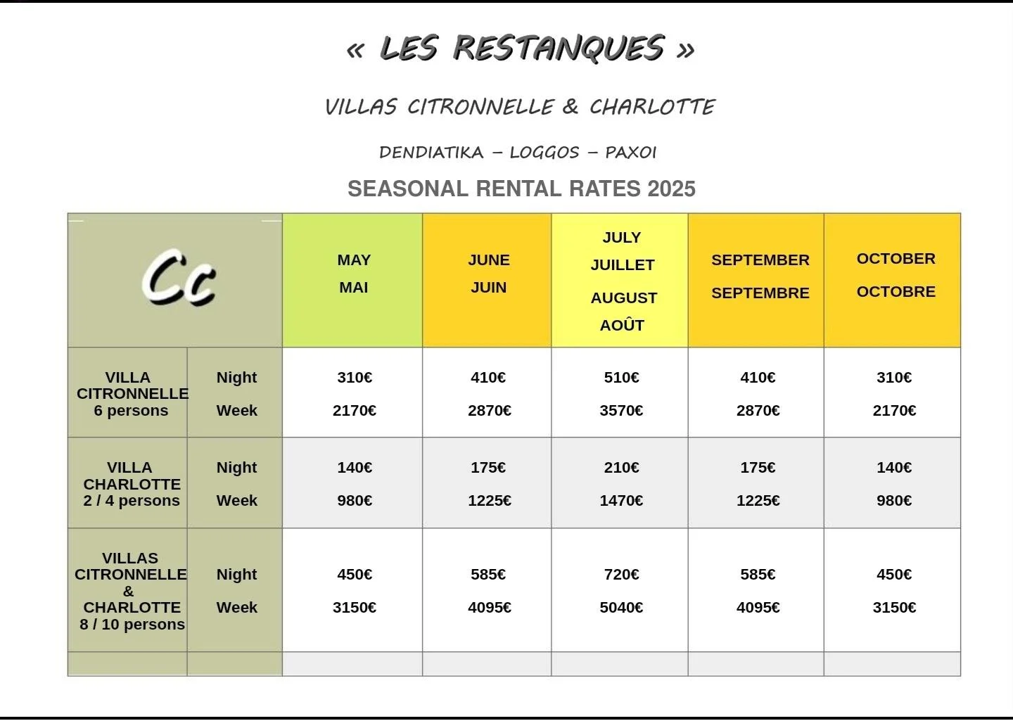 Tarifs & Disponibilités Voir en taille réelle Disponibilités Les Restanques (2 villas) Consulter Villa Citronnelle Consulter Villa Charlotte Consulter Contactez-nous Nom * Prénom Nom de famille E-mail * Message * Merci de votre intérêt ! Nous vous recontacterons rapidement.
