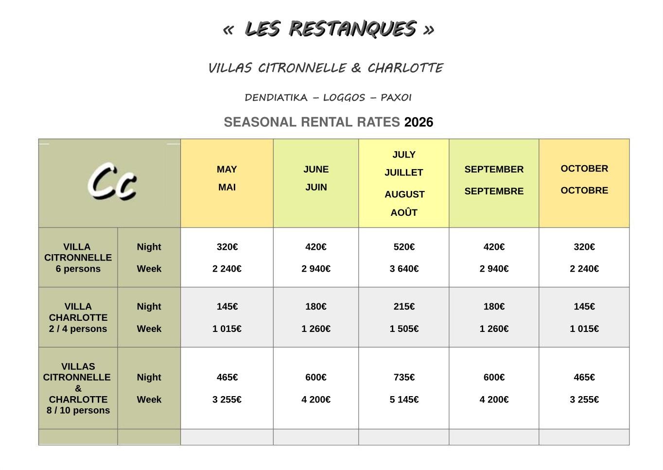 Tarifs & Disponibilités Voir en taille réelle Disponibilités Les Restanques (2 villas) Consulter Villa Citronnelle Consulter Villa Charlotte Consulter Contactez-nous
